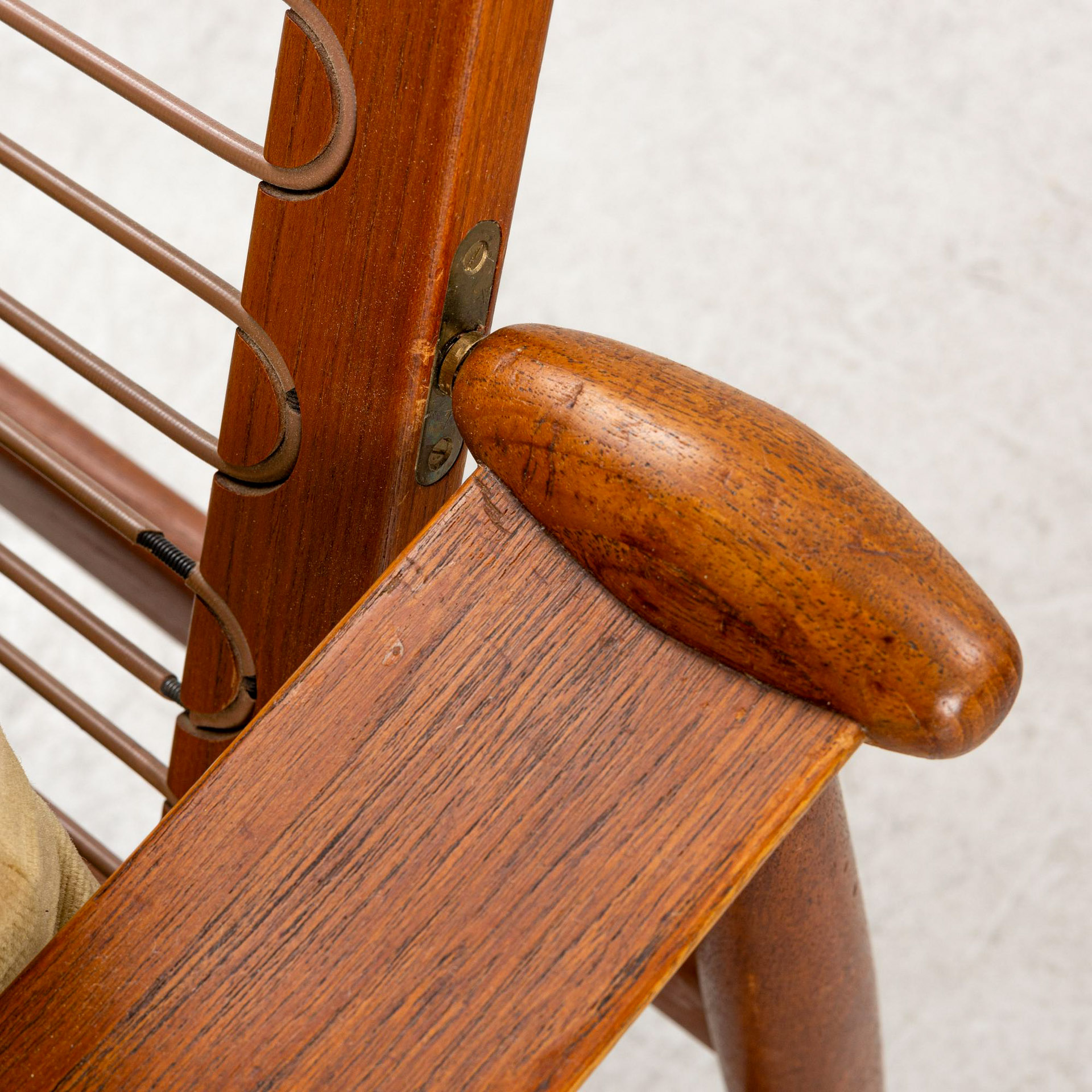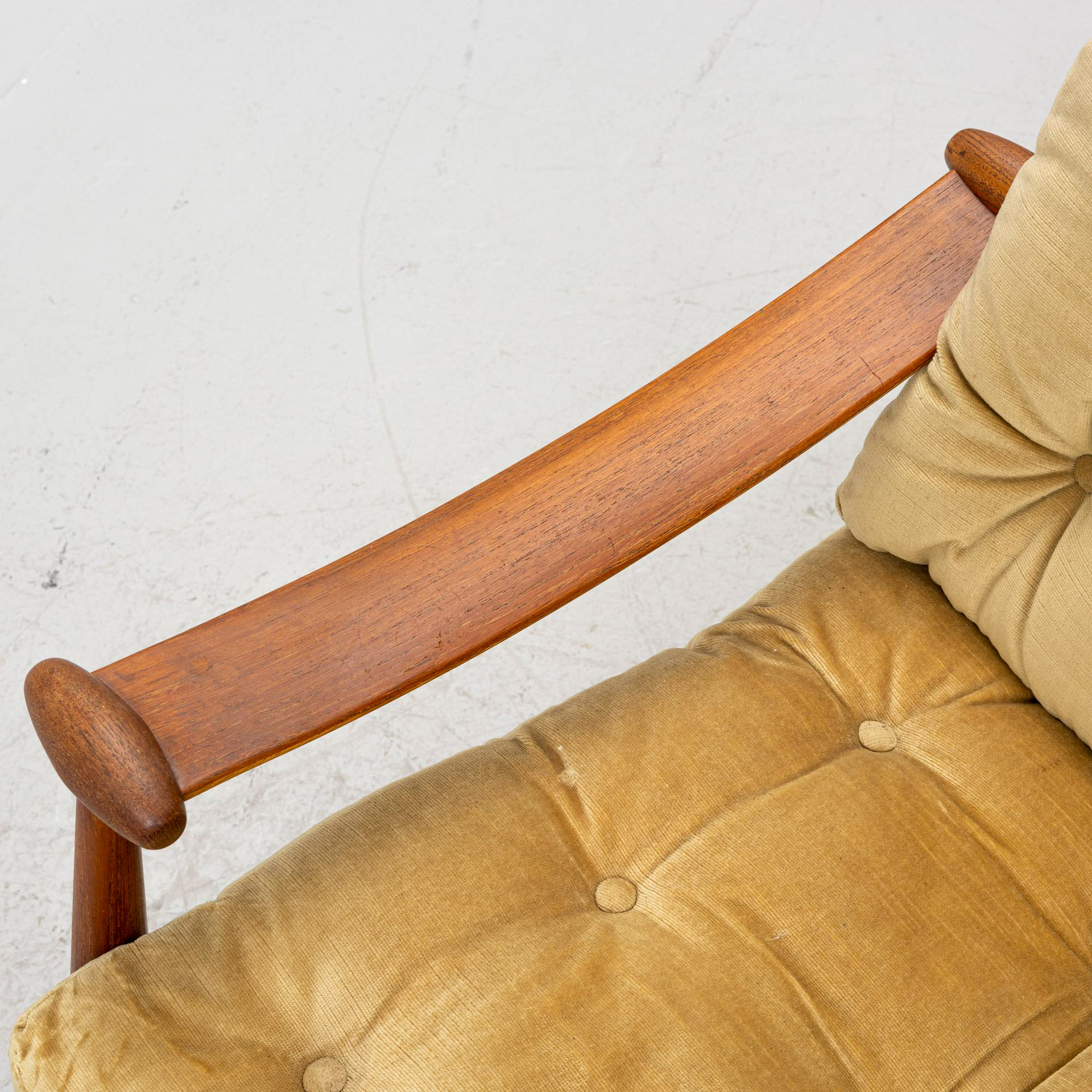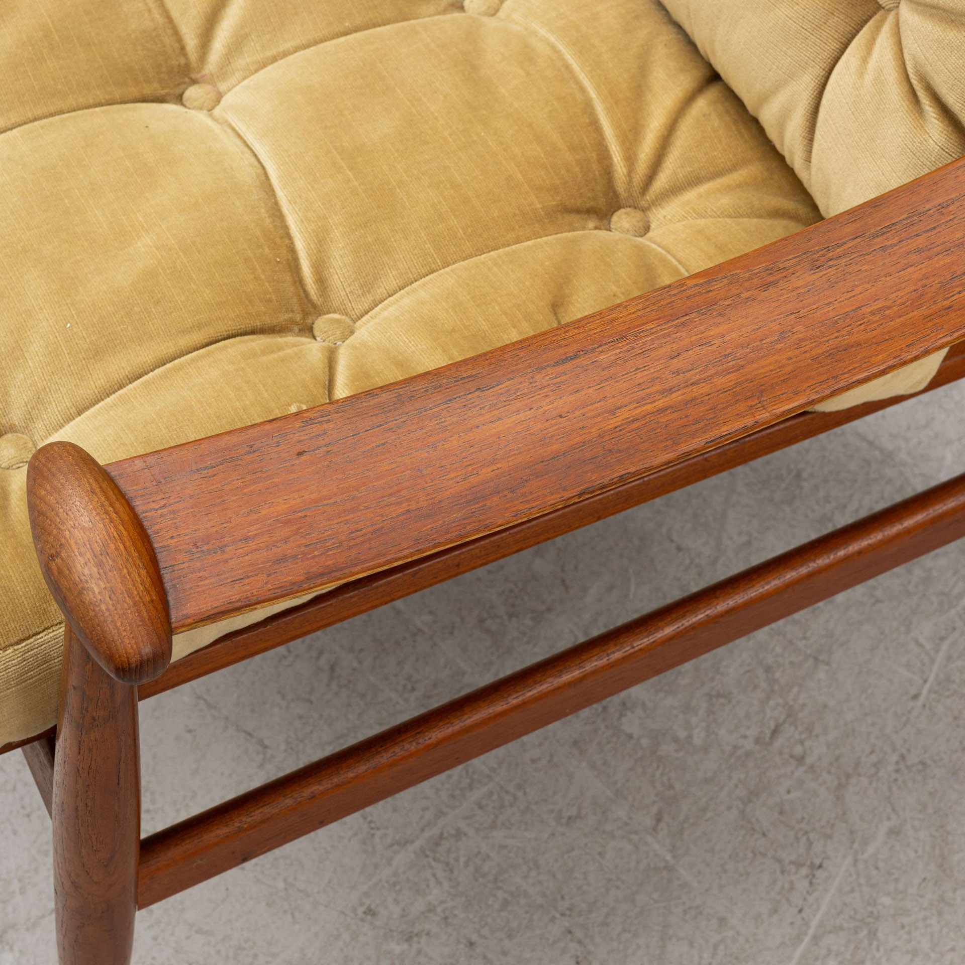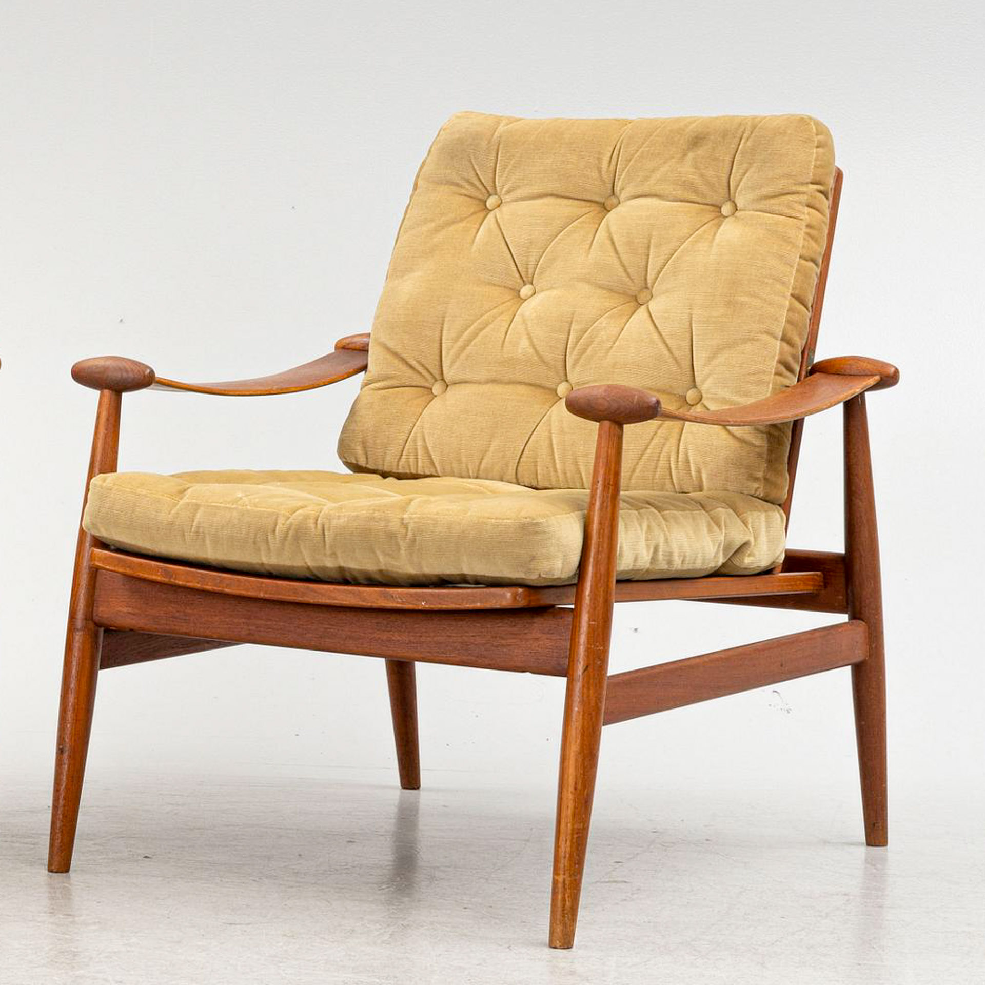 A “Spadestolen” (Model 133) armchairs, designed by Finn Juhl in 1953 and manufactured by France & Daverkosen (later France & Søn), Denmark. These armchairs exemplify Juhl’s sculptural approach to furniture design, combining organic forms, architectural balance, and modern comfort. The model takes its nickname “Spadestolen” (“The Spade Chair”) from the distinctive shape of its armrests, which resemble the flat blade of a spade. The frame is solid teak, masterfully shaped with smooth curves and subtle tapers with wide, flat armrests, seamlessly integrated into the frame and splayed outward in Juhl’s characteristic sculptural style. This piece has been reupholstered inappropriately and would benefit from reupholstering in more in keeping fabric and trim.