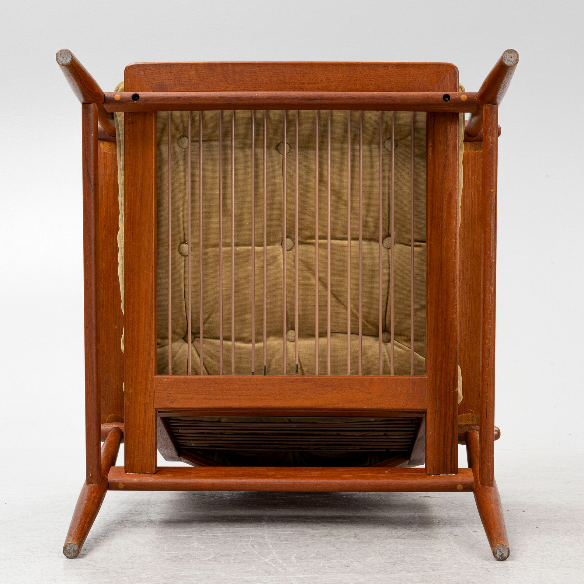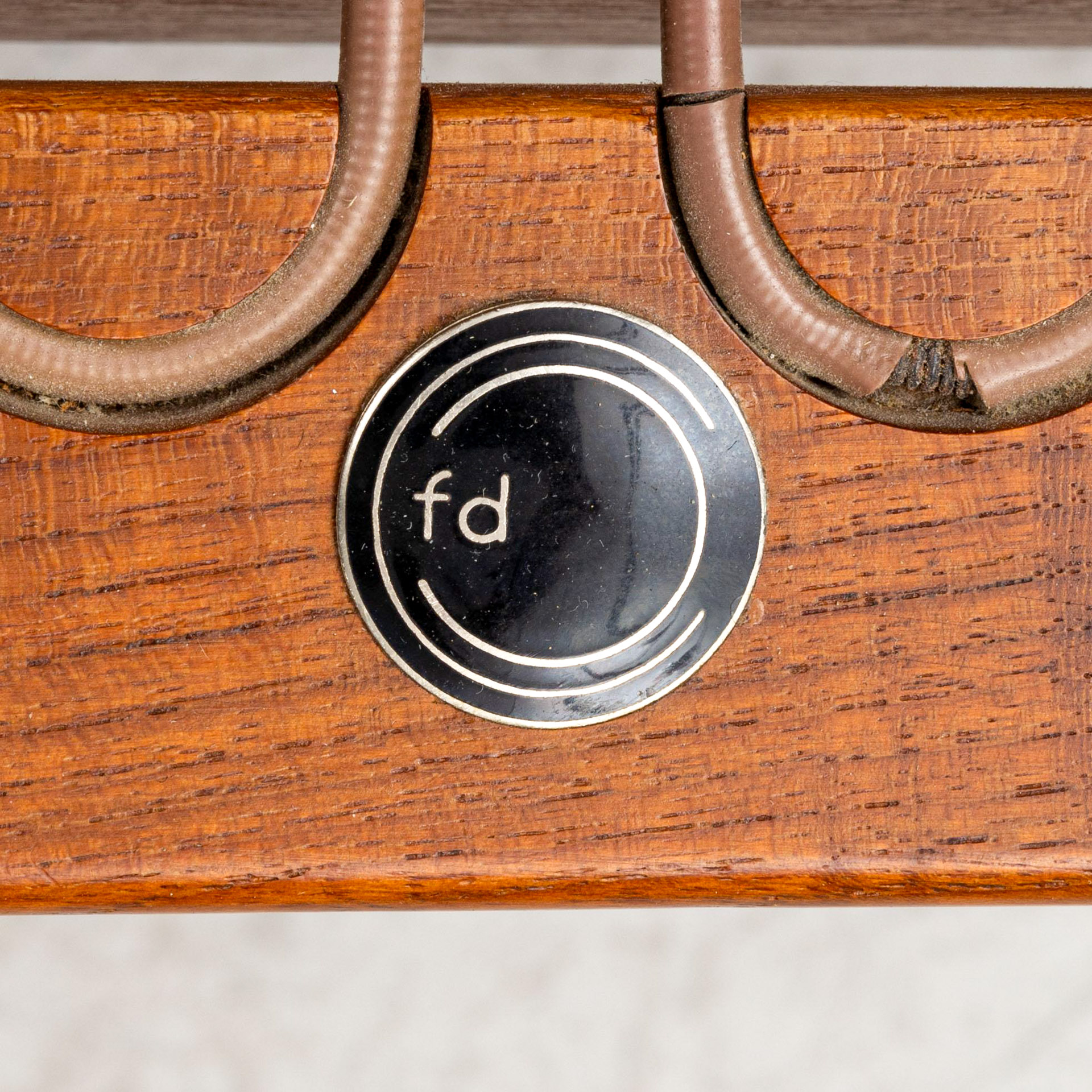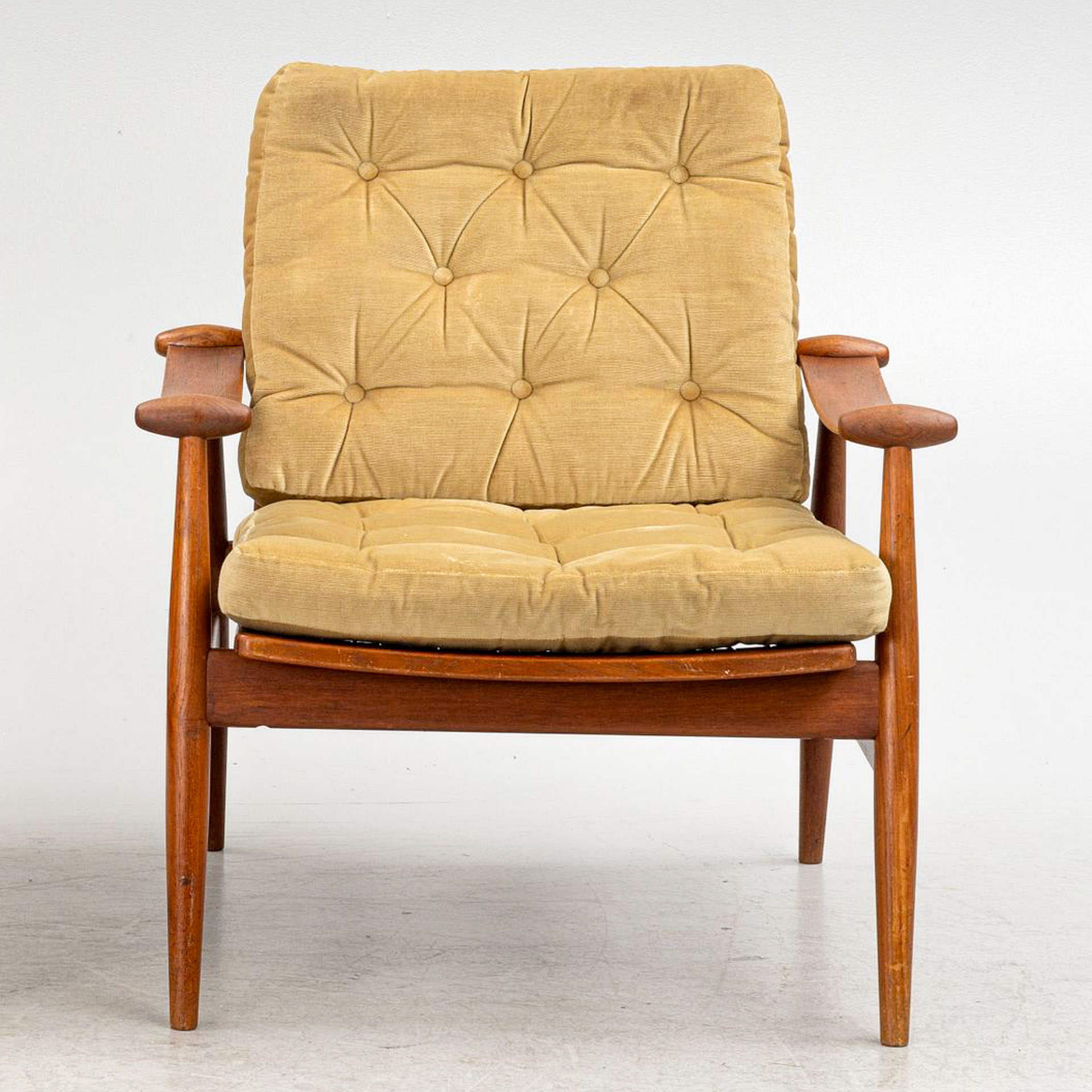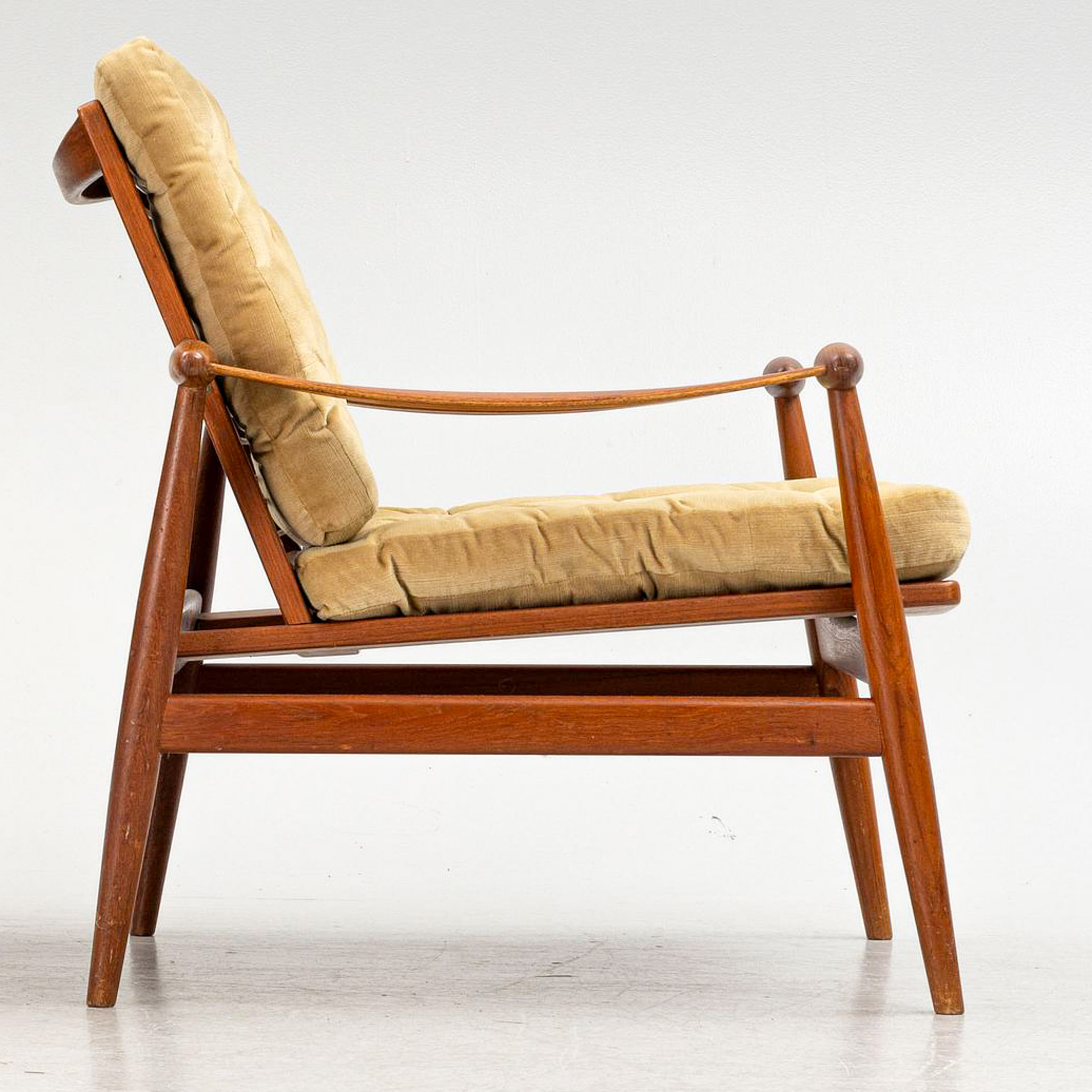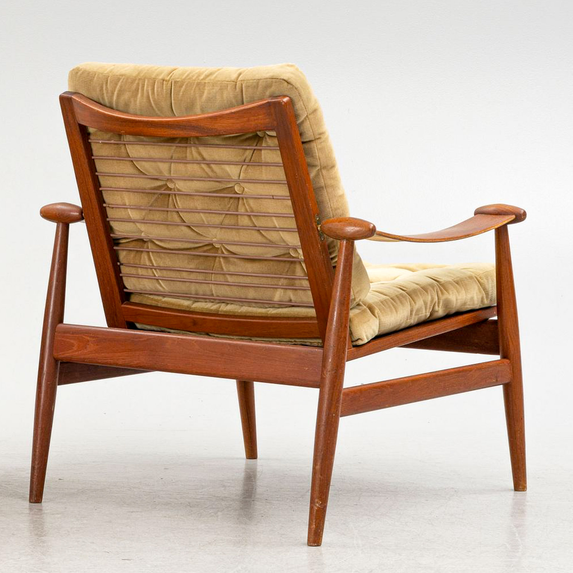 A “Spadestolen” (Model 133) armchairs, designed by Finn Juhl in 1953 and manufactured by France & Daverkosen (later France & Søn), Denmark. These armchairs exemplify Juhl’s sculptural approach to furniture design, combining organic forms, architectural balance, and modern comfort. The model takes its nickname “Spadestolen” (“The Spade Chair”) from the distinctive shape of its armrests, which resemble the flat blade of a spade. The frame is solid teak, masterfully shaped with smooth curves and subtle tapers with wide, flat armrests, seamlessly integrated into the frame and splayed outward in Juhl’s characteristic sculptural style. This piece has been reupholstered inappropriately and would benefit from reupholstering in more in keeping fabric and trim.