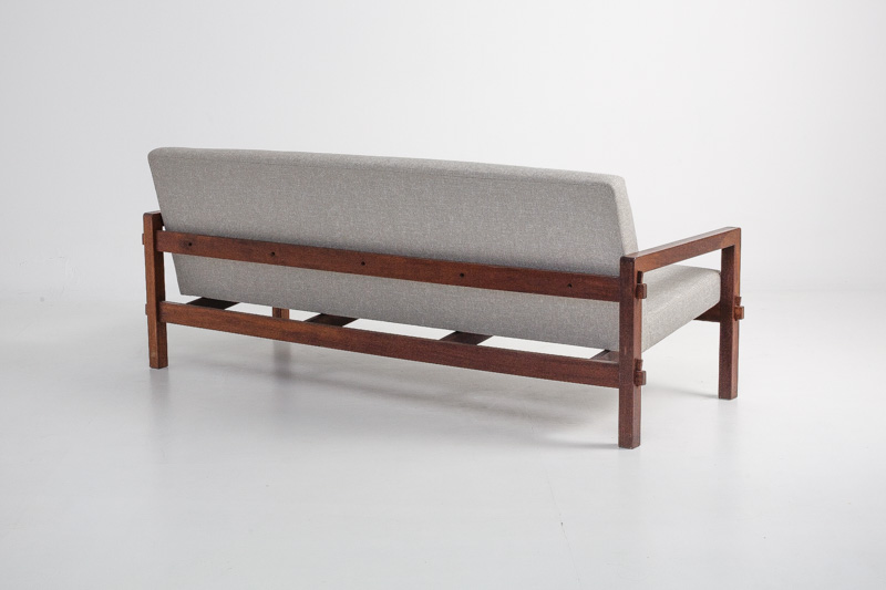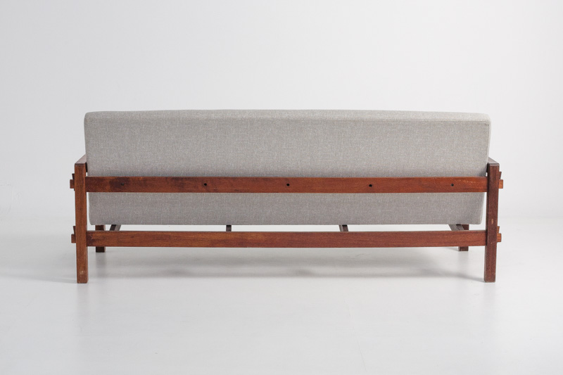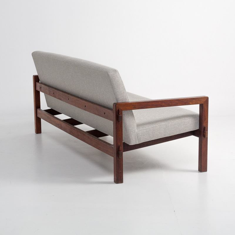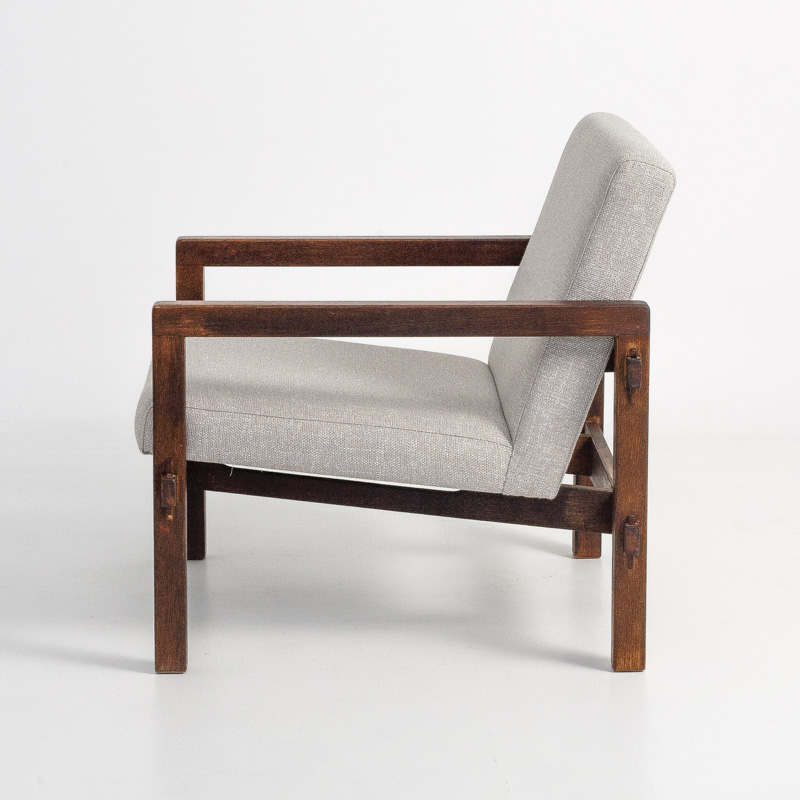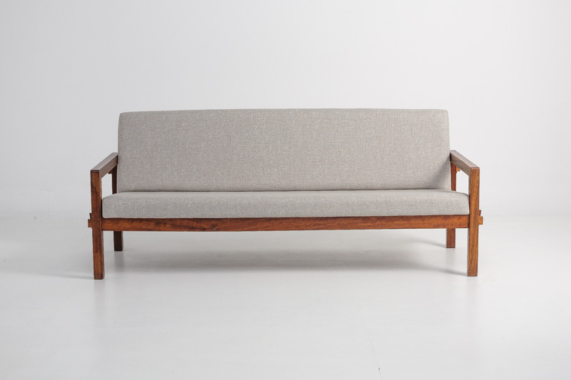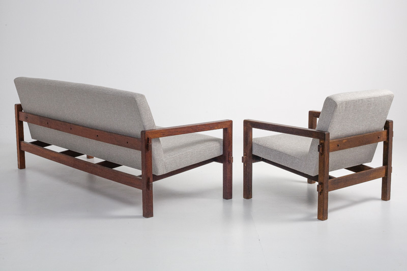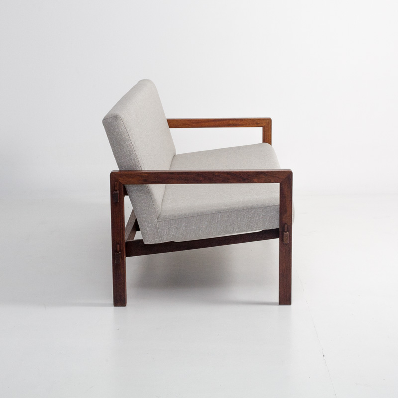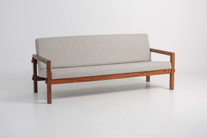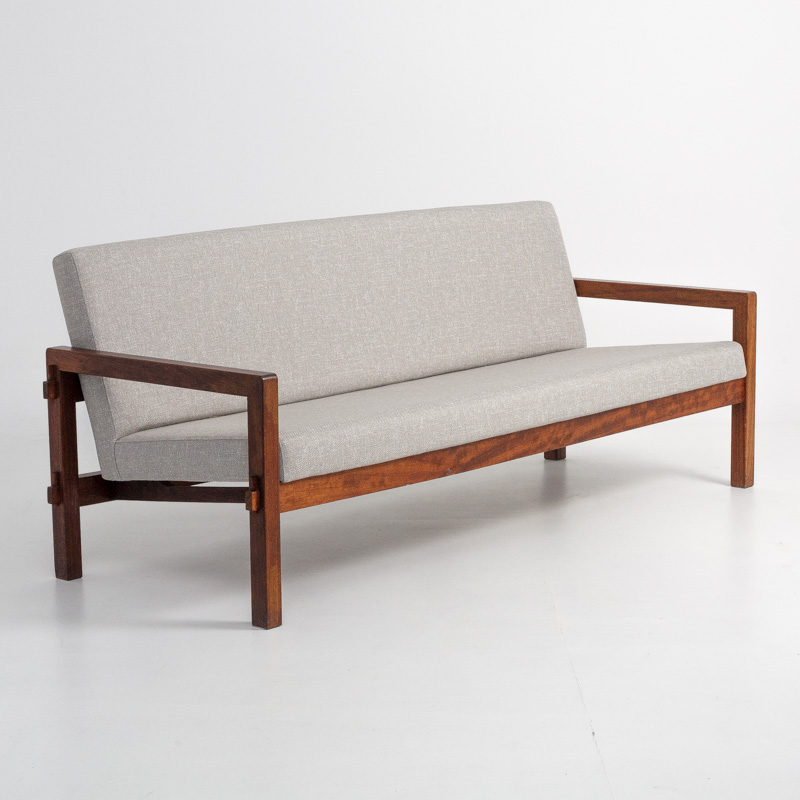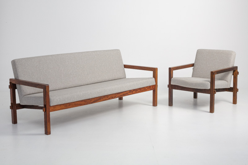 The sofa is with teak frame with later reinforcements. The armchair is with stained oak. The upholstery is later but in-keeping Lauritzon Diamond fabric.